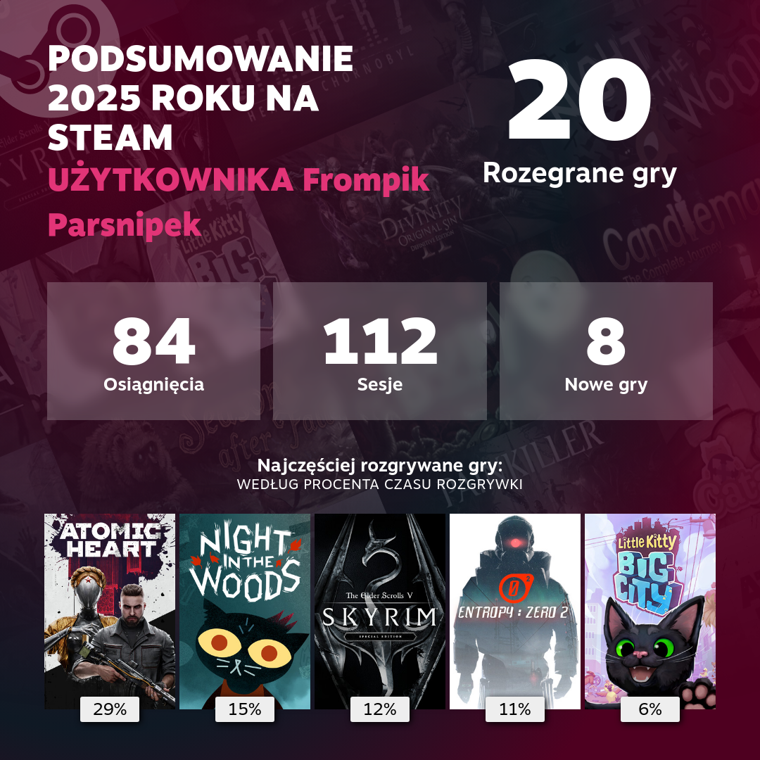 Little Kitty… i Silent Hill 2 niestety rozgrzebałam i zostawiłam, a Entropy : Zero 2 przechodzę na bieżąco (ostatnio miałam przerwę, bo proza życia – powoli kończymy remont i ogarniamy naprawdę duże porządki). W Skyrima pogrywam sporadycznie, bo jak wiadomo jest to obszerny i długi tytuł.